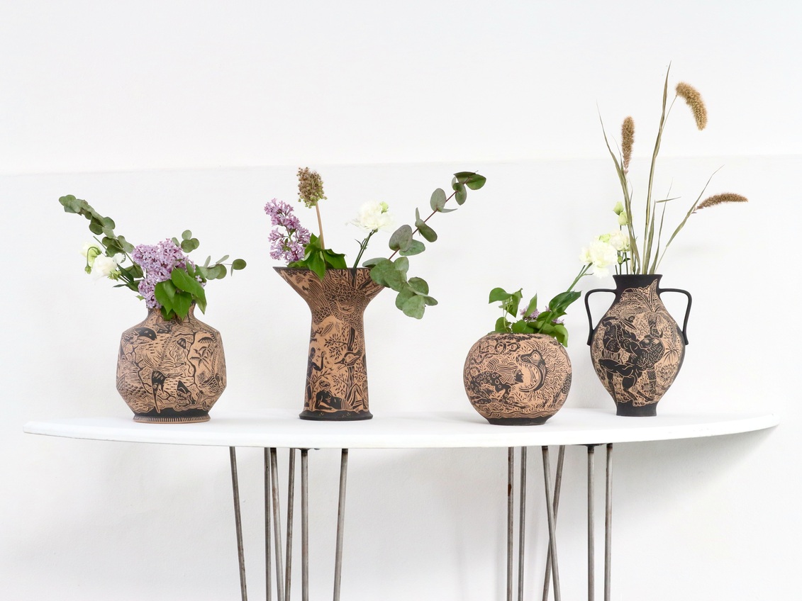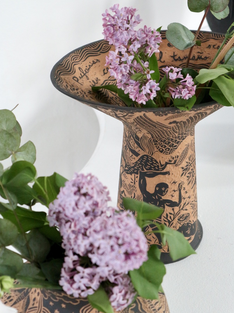 terracotta vase decorated with sgraffito technique, internally glazed / vaso in terracotta decorato tecnica a sgraffito, smaltato internamente