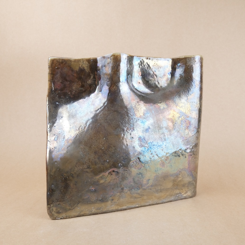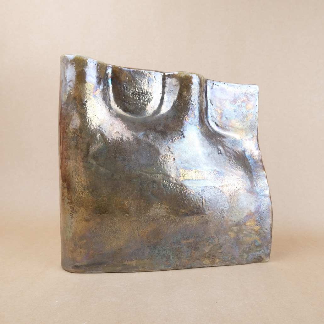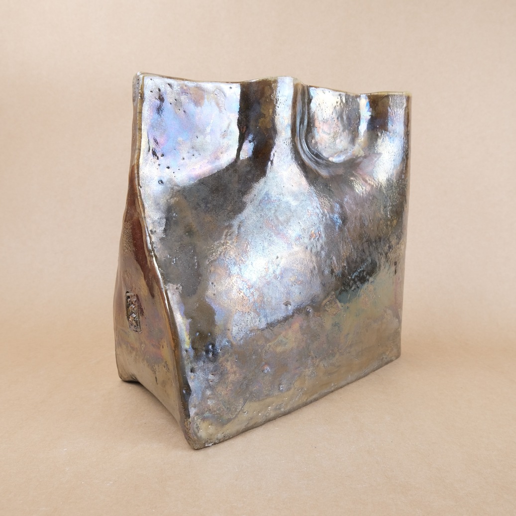 Technique: canister with double opening, raku firing, polished gold colour, embossed stamp on the body / tanica con doppia apertura, cottura raku, colore lucido oro, timbro a secco sul corpo