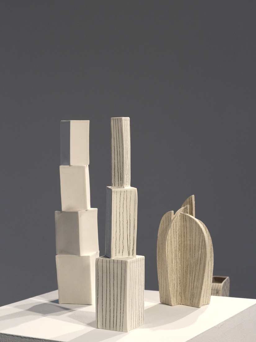 Kouzo Takeuchi, dalla prefettura di Hyogo in Giappone, si interessa ai temi di costruzione e distruzione dando vita a Modern Remains, una serie di opere ispirate dalla rottura accidentale di una ceramica e caratterizzate da complessi motivi geometrici composti da tubi quadrati di porcellana. Una volta completata la cottura e la smaltatura, Takeuchi intacca strategicamente le sculture con un martello. L’effetto di questo processo evoca sia antiche rovine che architetture contemporanee, spingendo lo spettatore a considerare che ciò che esiste ora un giorno sarà in appunto rovina.
