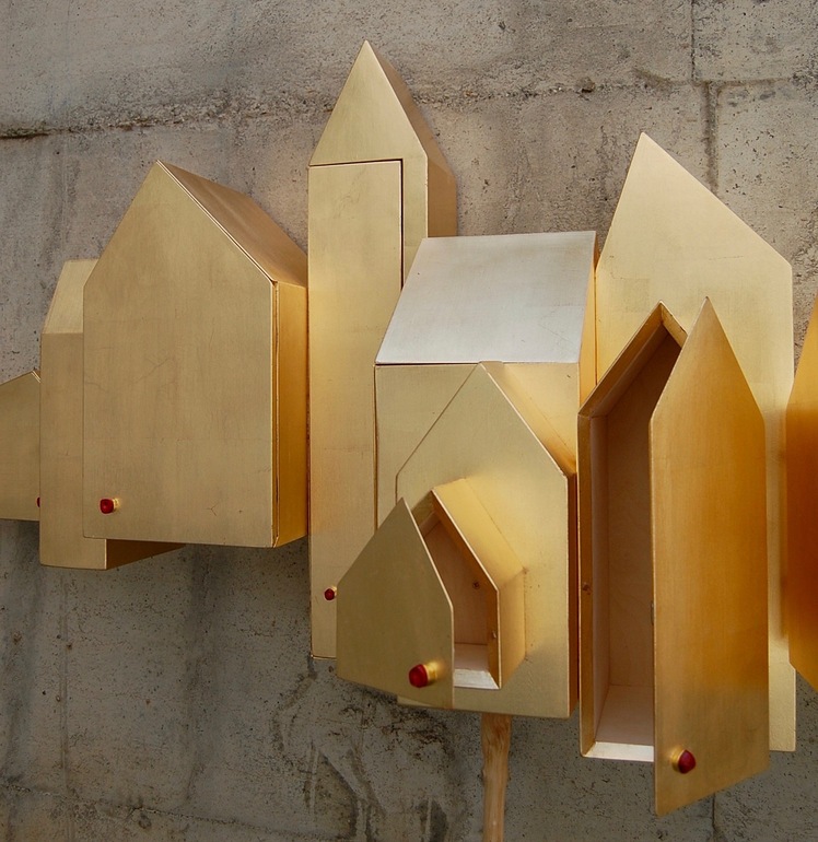 birch wood, gold leaf, natural branches from Franciacorta hills, small coral in a brass base as handle / legno di betulla, foglia d’oro, rami naturali delle colline della Franciacorta, piccolo corallo in una base di ottone come pomello